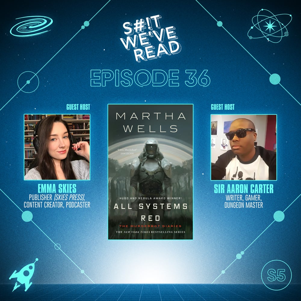 We’re kicking off Season Five with ALL SYSTEMS RED by Martha Wells—and a couple of very special guests! Sir Aaron Carter and Emma Skies join us to talk Murderbot ahead of the AppleTV+ adaptation premiering May 16th. (And yes, they’ll be covering the show in their very own Watch podcast, so stay tuned!)