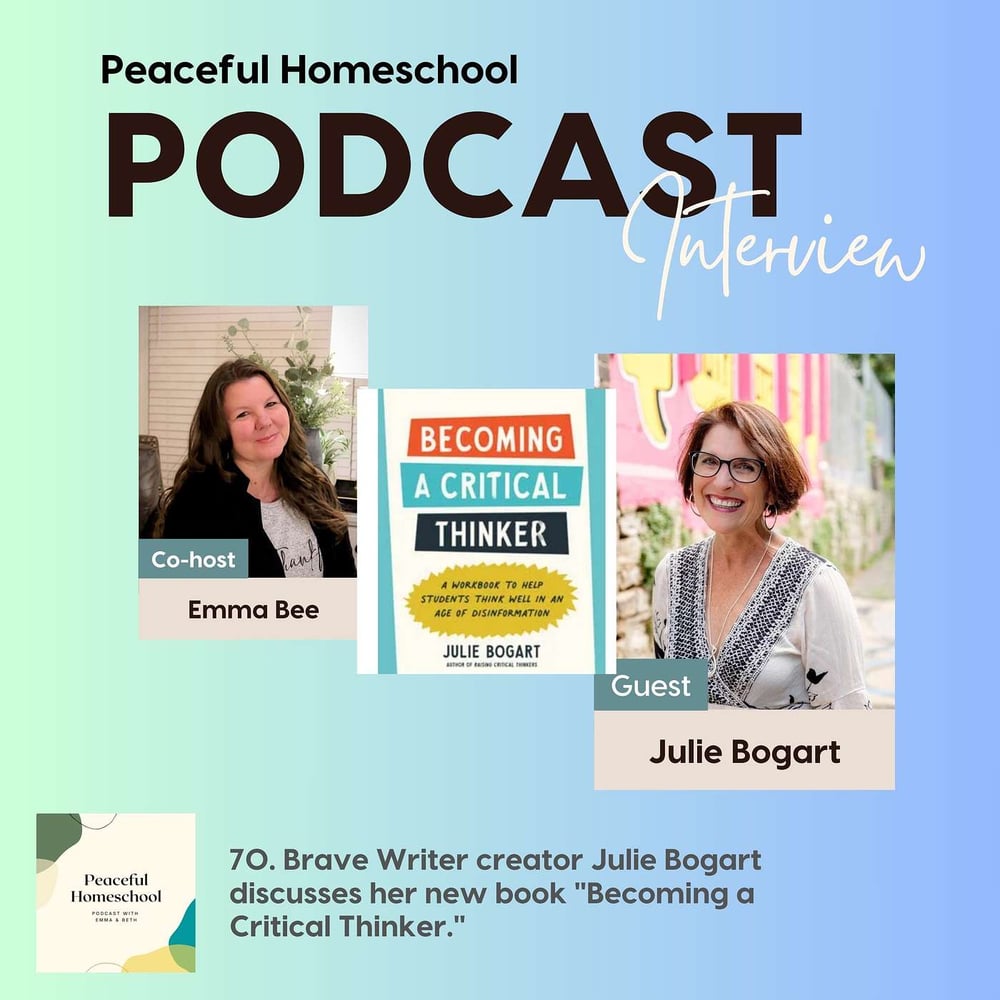Listen in to our interview with author and homeschooling mom Julie Bogart of Brave Writer! On this episode we’re discussing learning outside the box, encouraging a love of learning (and writing) in our kids, and the importance of critical thinking skills in today’s society. Julie shares strategies from her new workbook for helping kids to learn how to think critically.